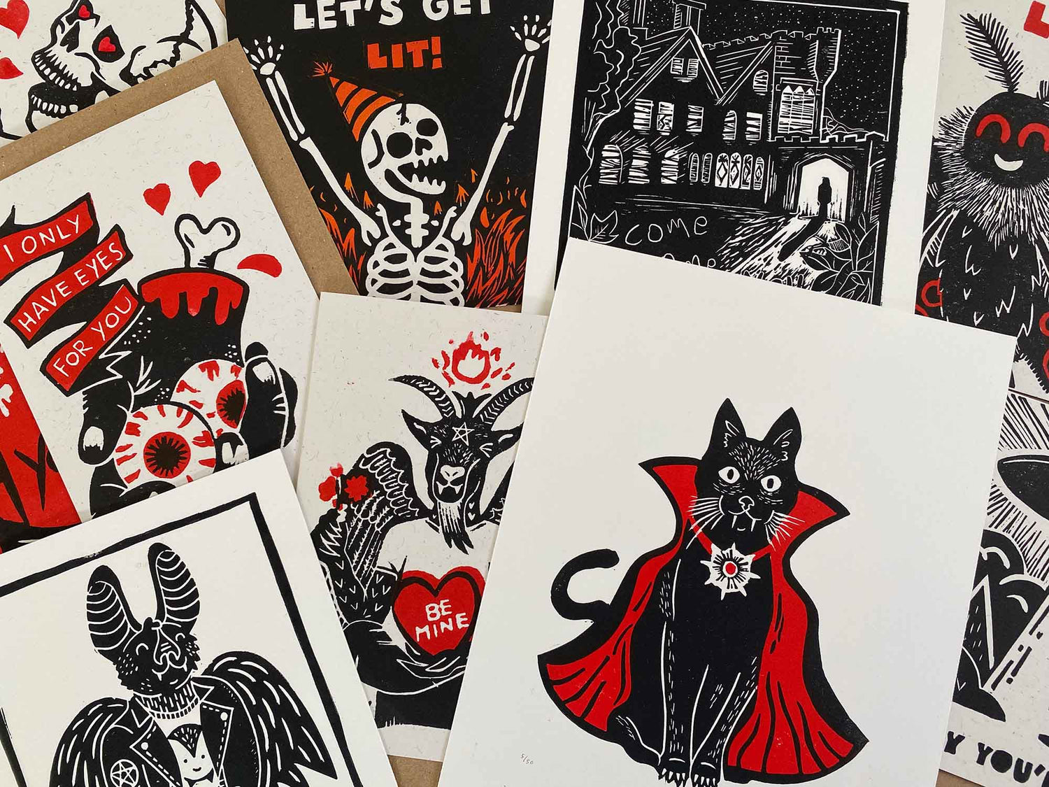 Cute and creepy linocut prints inspired by folklore, horror, pop-culture and nature.